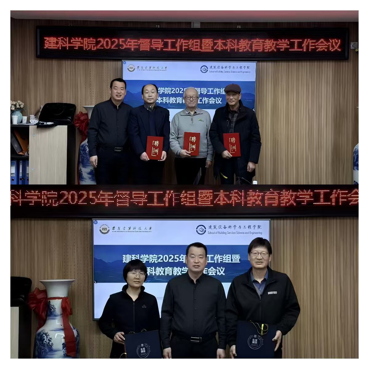 会上,督导组组长王齐铭说明了2025年教育教学督导的观察点,并对2025年教育教学督导工作进行了总结。李季渊和樊越胜结合个人督导工作实际,分别对本学期督导工作进行了总结,并分享了多位教师关于PPT制作、教学方式、实践教学等方面值得推广的经验。同时,督导组成员针对课堂教学表现、学风建设以及选修课内容深化等方面存在的问题,提出整改意见,并希望学院本科教学取得更大突破,持续提升教学质量与育人实效。随后,冯增喜为督导组三位老师颁发建筑设备科学与工程学院2026年本科教育教学督导聘书。